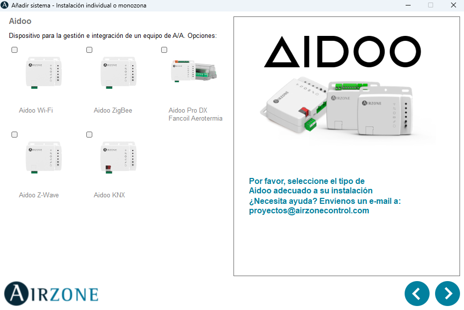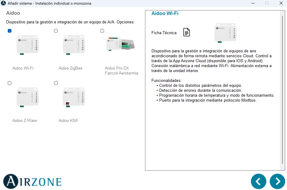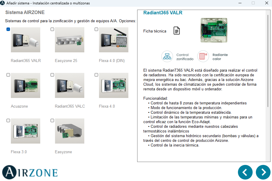 Si seleccionamos "Instalación con equipos monozona", aparecerá un nuevo panel que mostrará los productos disponibles para esta configuración.