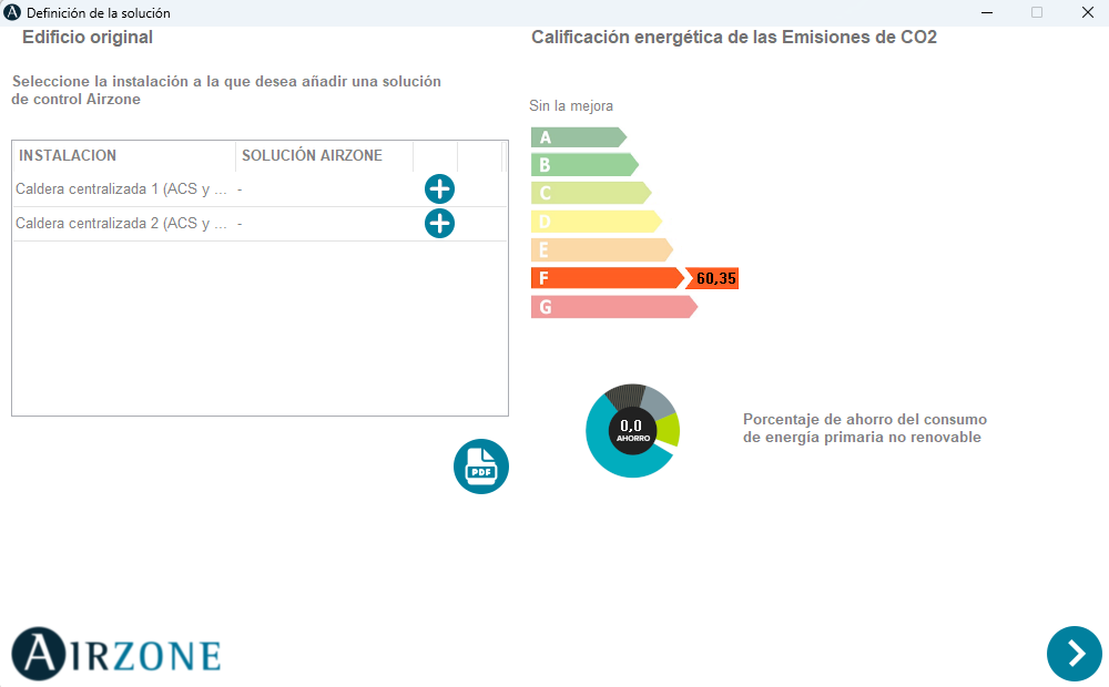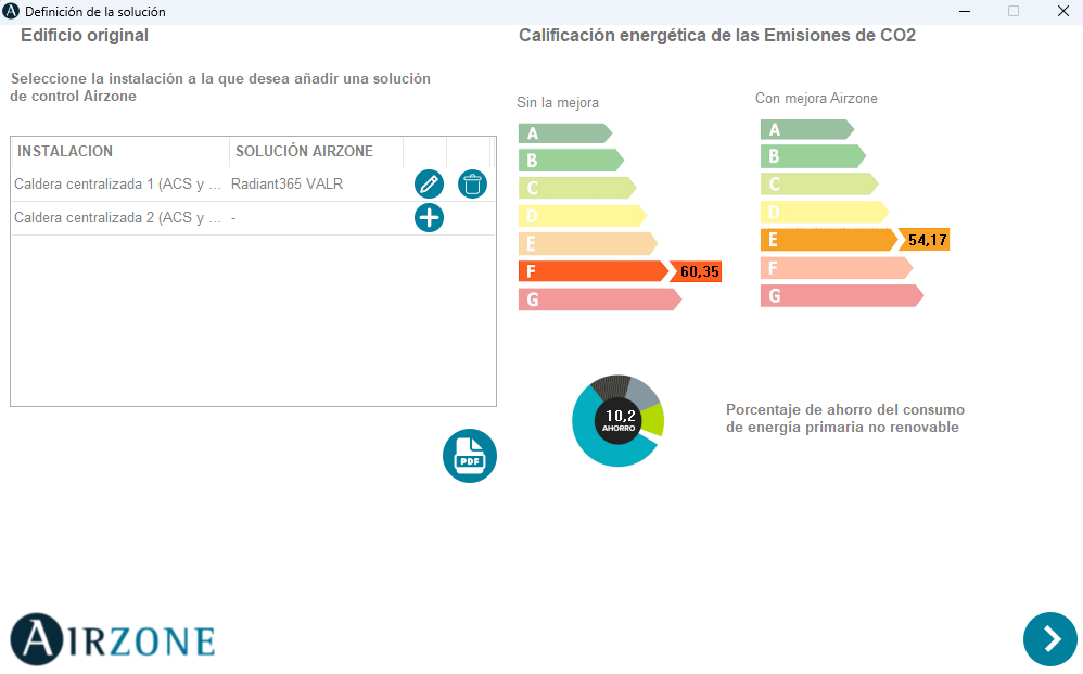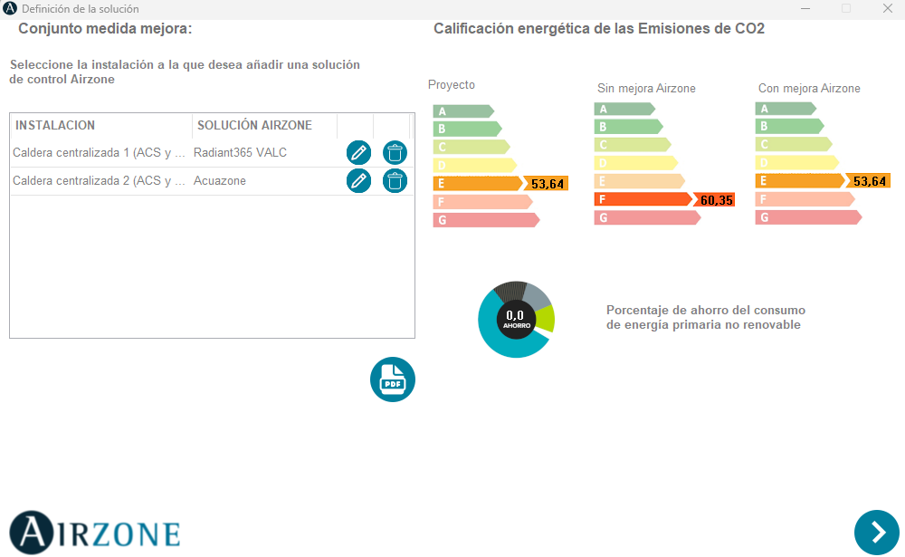 Siguiendo en la opción "Incluir Airzone en conjunto de mejoras" y habiendo cargado una solución Airzone previamente en la opción "Incluir Airzone en proyecto base", nos aparecerá el mismo panel pero con una etiqueta energética extra (proyecto, sin mejora Airzone, con mejora Airzone).