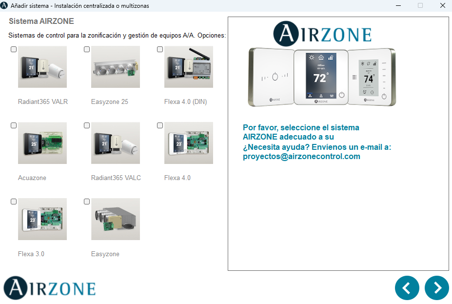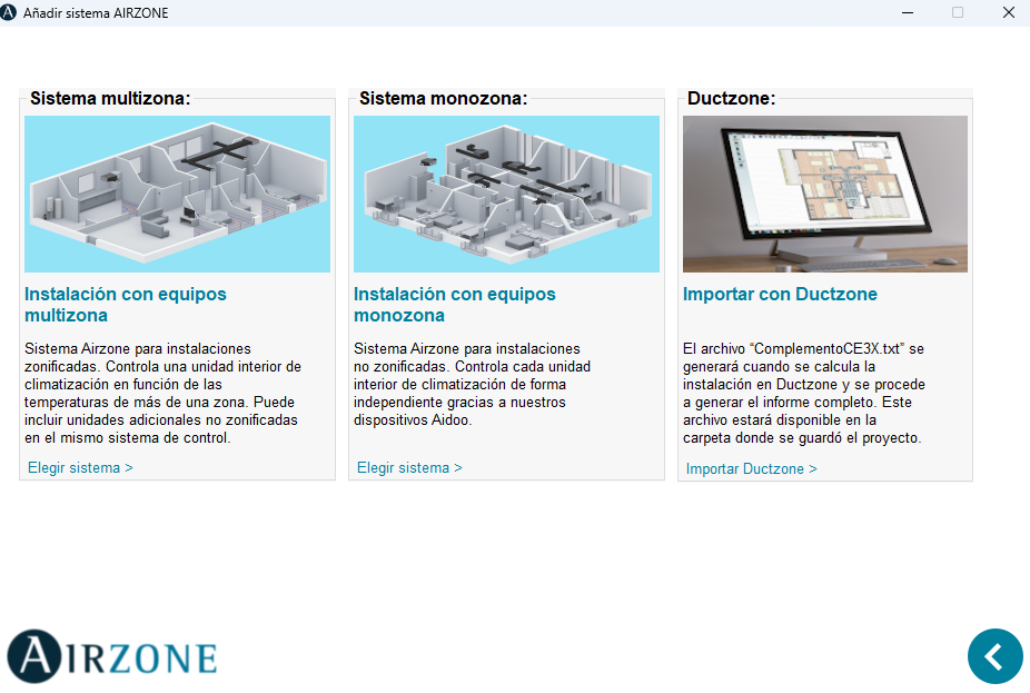 Cuando seleccionemos una solución de Airzone, se desplegará un panel donde podremos elegir entre las siguientes opciones: realizar una instalación con equipos multizona, una instalación con equipos monozona, o importar la configuración mediante Ductzone.