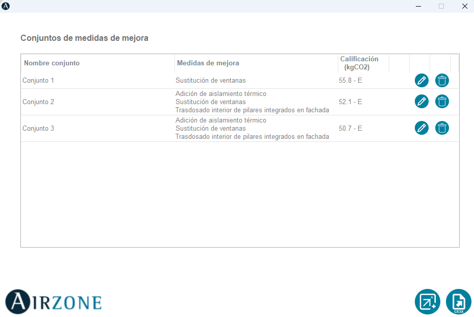 Al seleccionar la opción de incluir Airzone en conjunto de mejoras, aparecerá un panel en el que nos mostrará los conjuntos de medidas de mejora creados previamente en CE3X o, en caso de haber creado algún conjundo de mejoras desde el complemento de Airzone, también nos aparecerám. Cada conjunto de mejora tendrá sus botones de modificar y borrar.