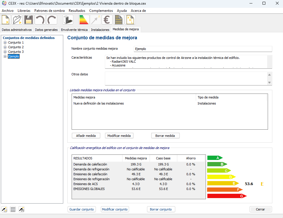 Cuando hayamos exportado los conjuntos de mejora a CE3X, veremos en la pestaña "Medidas de mejora" como se nos ha cargado el conjunto de mejora que hemos creado en el complemento.
