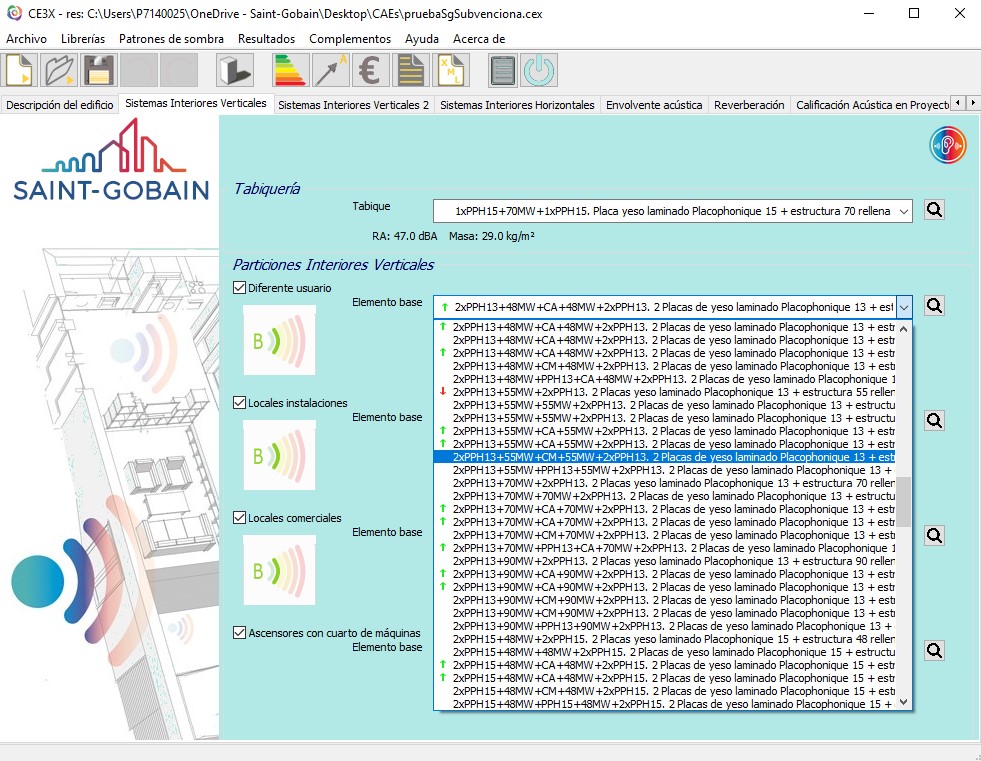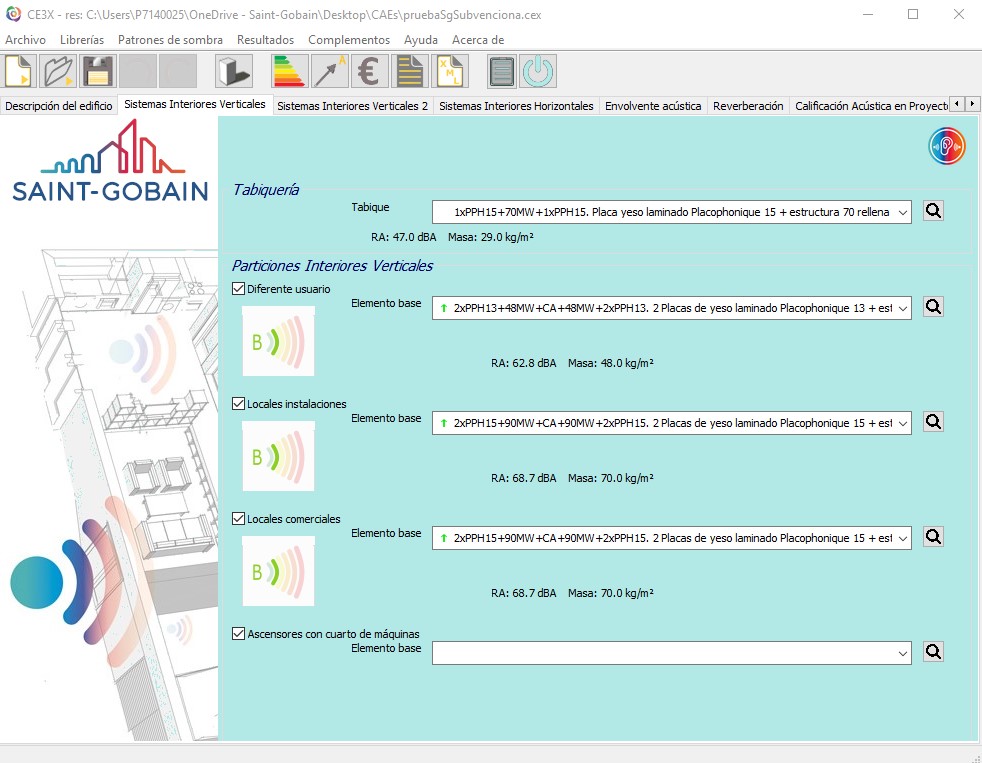 El usuario puede elegir los sistemas constructivos de una base de datos precargada con el Catálogo de Elementos Constructivos del CTE del Instituto Eduardo Torroja y una batería de ensayos Saint-Gobain o crear su propia librería de elementos constructivos acústicos para incluirlos en el proyecto.