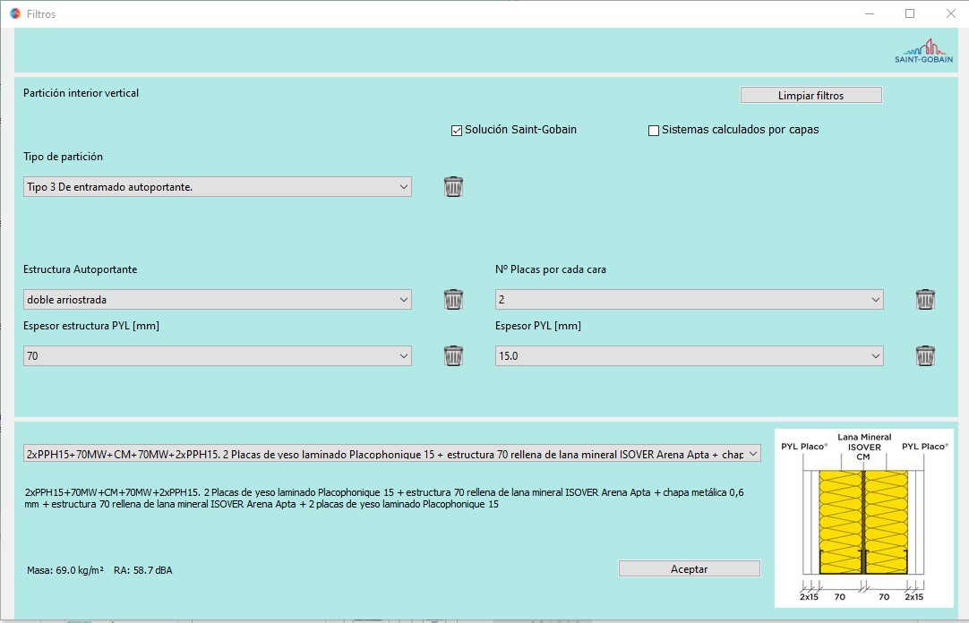 El complemento tiene una serie de filtros que permiten al usuario encontrar la solución más adecuada para el proyecto. Además, ofrece una orientación de la calidad acústica del sistema, dependiendo de la pre-calificación acústica parcial que se vaya a obtener con el mismo.