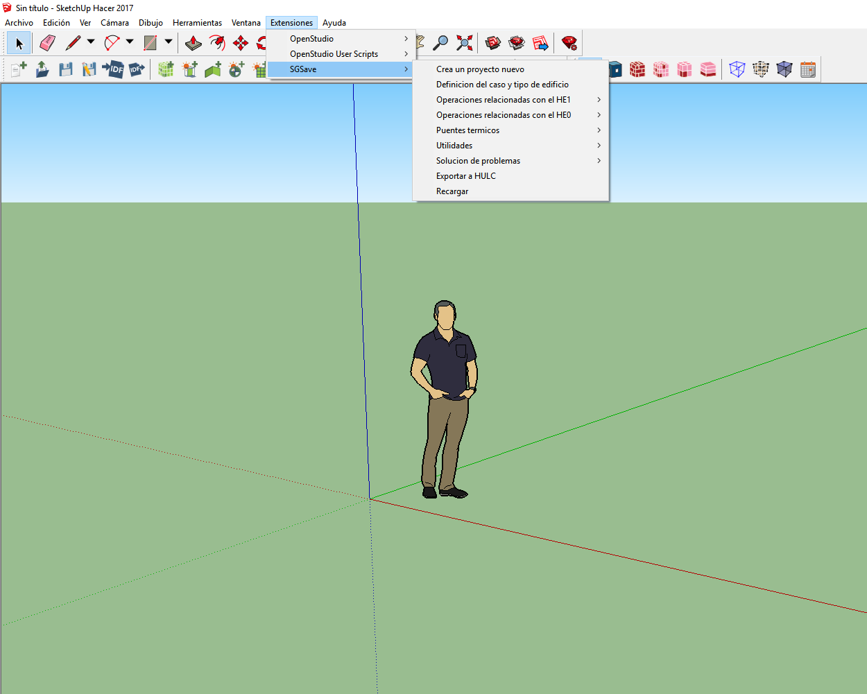 Si la instalación del complemento SG SAVE se ha realizado de forma correcta dentro del menu "Extensiones", tienen que aparecer las opciónes: "OpenStudio", "OpenStudio User Scripts" y "SG SAVE".